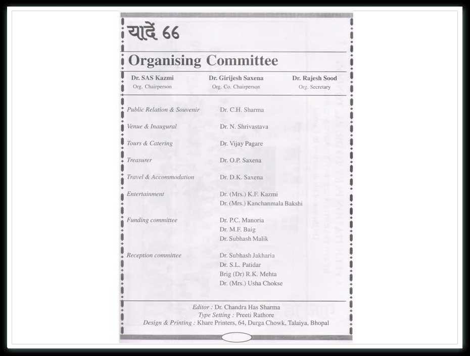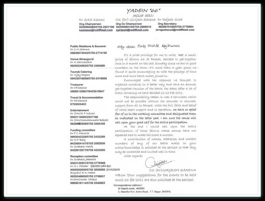 It is year 2011 the batch organised its own group YADEIN-66 as an standing committee with Dr SAS Kazmi as the Chair person. Col(Dr) Girijesh Saxena as the Co- Chair person, Dr, Rajesh Sood Organising secretary.