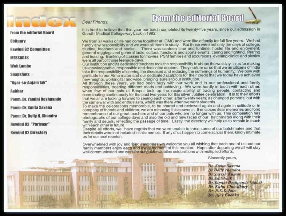 We from all walks of life had come together at GMC and were like a family for full five years. We had hardly any responsilbility and we were all there to study. But Those were not only the days of College,studies, teachers, and books. Tere was canteen time and funtime, hostel life, and enjoyment,general raggings and general tadis,cultural finctions and sports events,caring and fighting,sharing and teasing. Bunking of Classes for movies,PSM Families and excursions,evening clinics and picnics were all parts of those teenage days.
